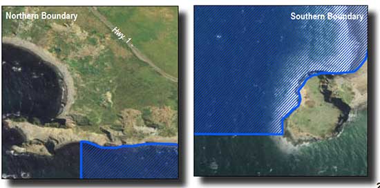 This area is bounded by the mean high tide line, the mouth of the Russian River estuary as defined in subsection 632(b)(14)(A), and straight lines connecting the following points in the order listed: