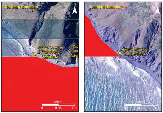 This area is bounded by the mean high tide line and straight lines connecting the following points in the order listed except where noted: