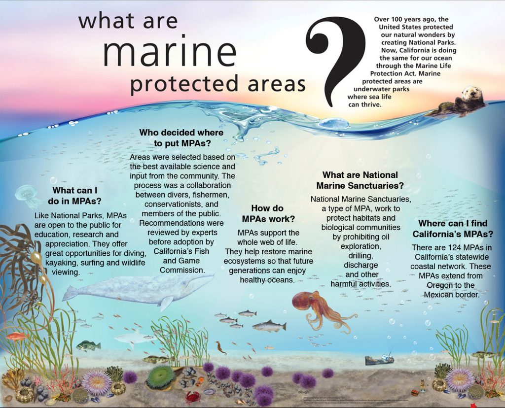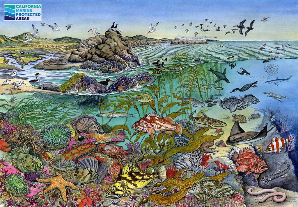 This poster was created by the California Department of Fish and Wildlife showcasing species and habitats that are likely to benefit from California’s Marine Protected Areas.