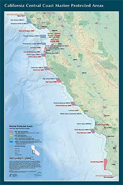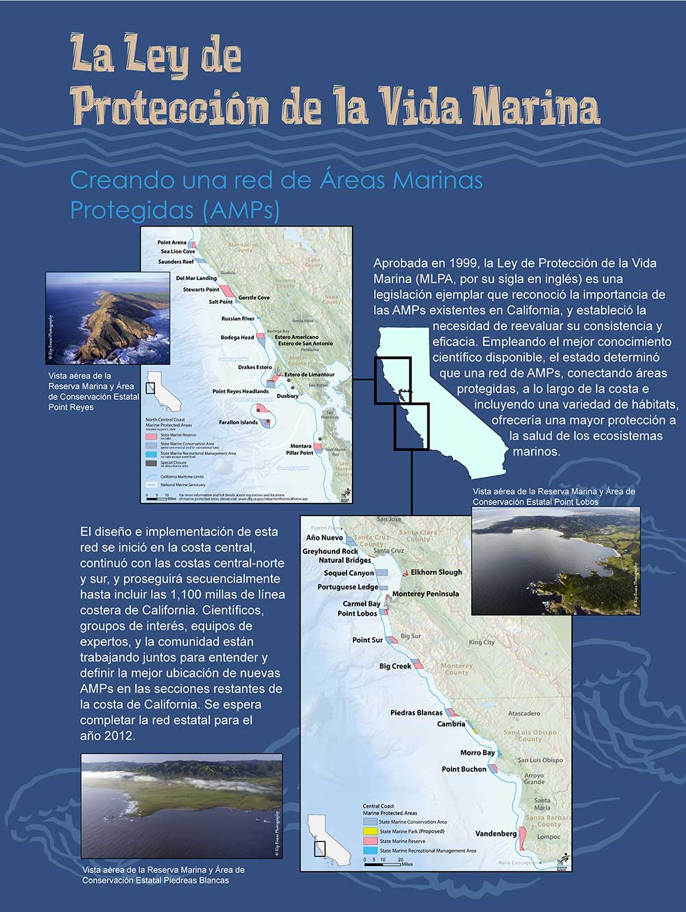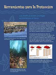 La exhibición sobre las AMPs de la Costa Central de California fue creada para presentar al público la importancia y el valor de esta nueva y única red de áreas protegidas en el océano. Estos paneles describen el propósito de las AMPs, ofrecen mapas de las AMPs designadas en la costa central y costa norte, y explican brevemente la ciencia que las respalda.